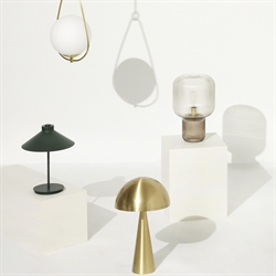 Denne bordlampe er lavet af metal og messing ,som er med til at give lampen dens gyldne farve. Lampeskærmens kuppelform og den kegleformede fod skaber en svampelignende form. Placer lampen på dit skrivebord, i vinduet eller på sofabordet.Læs mere