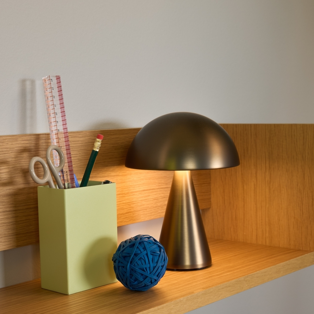 Oplev et strejf af elegance, der lyser op, hvor end du går, med vores evigt klassiske Mush Transportabel Lampe i en lille bærbar version. Med en klassisk finish i brændt messing forener denne elegante lampe stil med bekvemmelighed. Den er den perfekte følgesvend til dine sene nattelæsninger eller hyggelige aftensnakke indendørs.