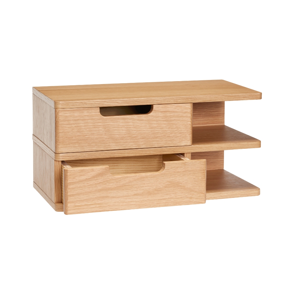 Giv dit soveværelse eller indgang et smart og minimalistisk touch med Open Væghylde/Sengebord. Den er lavet af FSC-certificeret egetræ og egetræsfiner. Den er pladsbesparende og kompakt, og med to skjulte og åbne hylder har den masser af opbevaringsplads til dine nødvendigheder. Placer den på væggen nær din seng eller i indgangen. Det bedste af det hele er, at den kan spejlvendes og bruges på begge sider af din seng.